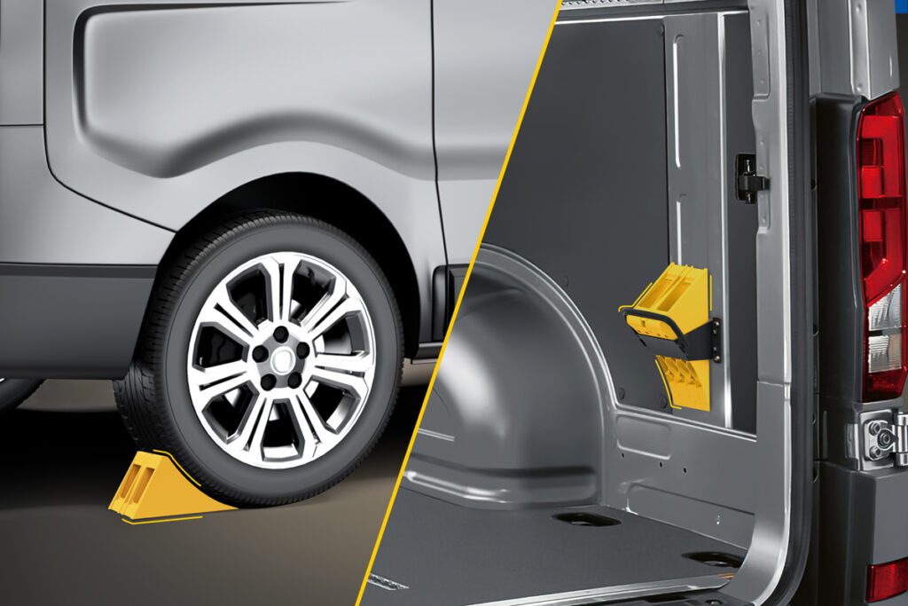 Lokhen has designed the Crowny 36 wheel chock, compact, easy to handle, and not bulky at all, ideal for ensuring the safety of work vehicles. Thanks to its Double wheel chock holder, it can be conveniently stored inside the van.